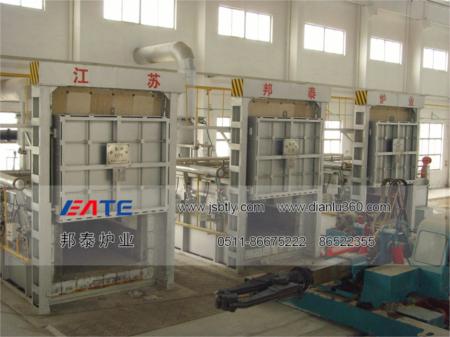 本套淬火機組有多臺鐘罩式電阻爐與一臺淬火操作車組合為一個快速淬火機組生產(chǎn)線,一個機組可以根據(jù)用戶的產(chǎn)量和工藝要求配套幾臺不同的爐型,爐子的數(shù)量和爐型可以自由組合,本生產(chǎn)線可滿足不同的生產(chǎn)工藝如:淬火、回火、退火、調(diào)質(zhì)等熱處理工藝,爐溫有1200℃,950℃,700℃等,每條生產(chǎn)線配有一臺快速下水淬火操作車,該操作車可上下、左右、前后六個方向移動,工件熱處理完成后,操作車迅速進入爐內(nèi)將工件從爐膛內(nèi)叉出,并快速落入水池或淬火液池內(nèi),整個過程在1分鐘內(nèi)完成,生產(chǎn)效率高,操作方便,從而保證了工件的淬火質(zhì)量。