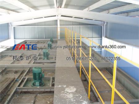 臺車上按裝有耐壓抗高溫的鑄鋼爐底板,以承載工件之用。為了防止工件加熱后產(chǎn)生的氧化皮通過爐底板間的縫隙落入加熱元件周圍而造成加熱元件損壞,因此爐底板與爐體接觸處采用插入式接觸。